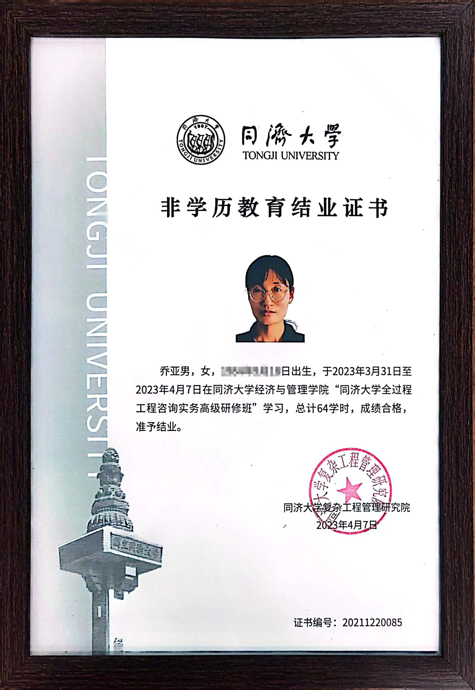 1、4月7日,由同濟大學經(jīng)濟與管理學院高管教育中心、同濟大學復雜工程管理研究院聯(lián)合主辦的“全過程工程咨詢實務及企業(yè)轉(zhuǎn)型升級發(fā)展高級研修班”第十一期結業(yè),我公司派修的副總工程師、技術管理部主任喬亞男獲取結業(yè)證書。